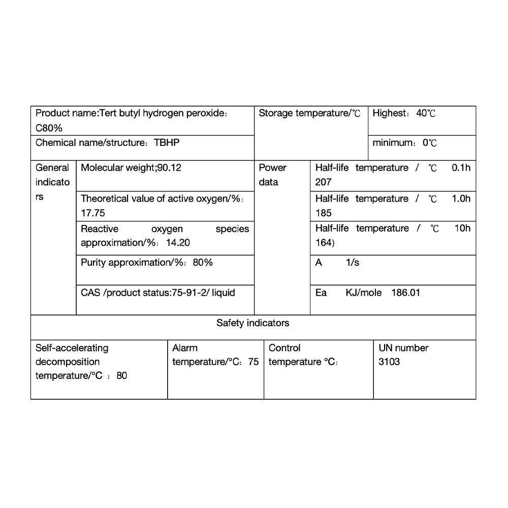 TBHP es uno de los iniciadores más comunes de reacciones de radicales libres, que se caracteriza por una buena estabilidad térmica, uso seguro, fácil control, ningún cambio significativo en la actividad dentro de tres meses por debajo de 40 ℃ y la necesidad de un costoso almacenamiento congelado, y puede usarse en emulsión.