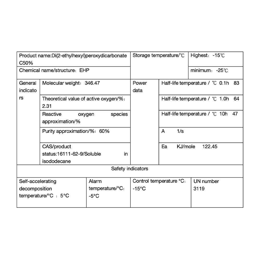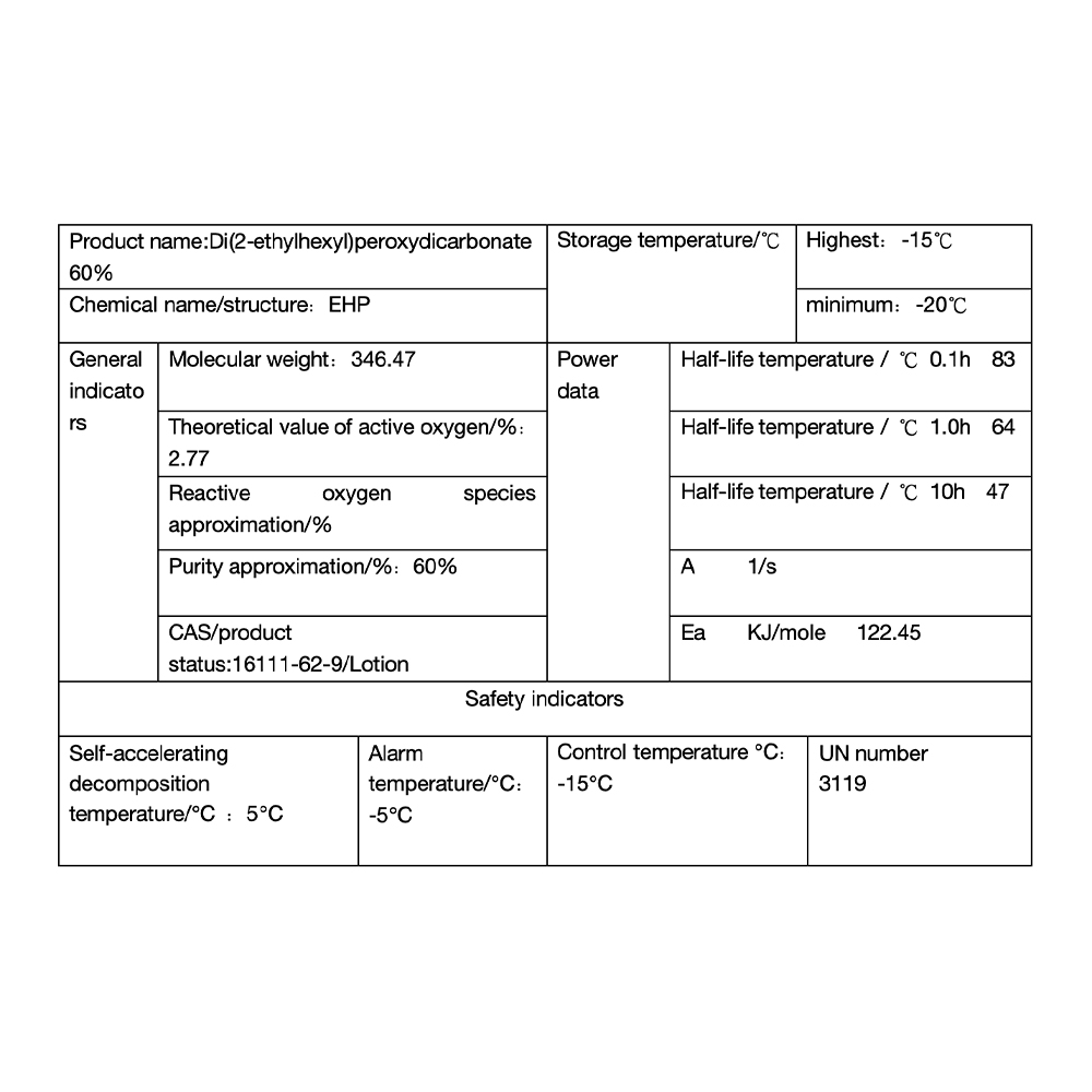 EHP es uno de los iniciadores más utilizados de polimerización en suspensión acuosa de cloruro de vinilo. Se utiliza en combinación con CNP (peróxido de isopropilfenilo), LPO (peróxidodecanoilo), etc. para mejorar la actividad de la reacción y la temperatura de polimerización es de 40-65°C.