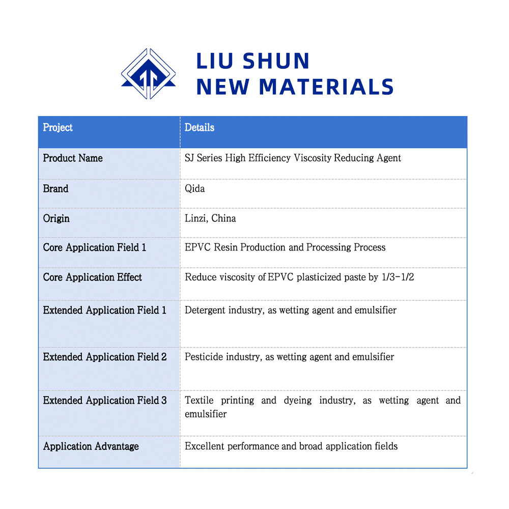 Después de completar la polimerización en emulsión de la resina EPVC, agregue entre 0,1 y 1 % del volumen de la emulsión como reductor de viscosidad de alta eficiencia SJ. Luego la mezcla se agita y se seca para obtener resina EPVC con menor viscosidad. Alternativamente, durante la preparación de la suspensión de resina EPVC, agregue entre 0,5 y 2 % del volumen de resina como reductor de viscosidad de alta eficiencia DF según el nivel de viscosidad para lograr una consistencia óptima. Tenga en cuenta que el reductor de viscosidad de alta eficiencia SJ debe precalentarse antes de su uso cuando la temperatura ambiente sea inferior a 10 °C para mantener una buena fluidez para la aplicación.